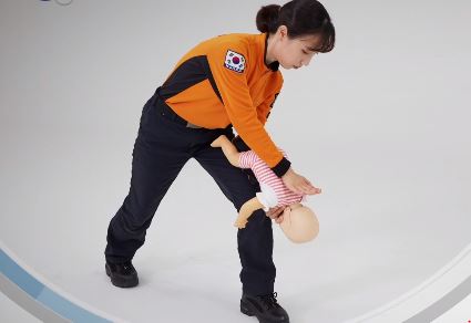 -왼손으로는 영아의 턱을, 오른손으로는 영아의 뒤통수를 감싸면서 천천히 안아 올린 뒤, 왼쪽 허벅지 위에 머리가 아래를 향하도록 엎드려 놓습니다. 그런다음 손바닥 밑 부분으로 양쪽 날개뼈의 가운데를 세게 5회 두드립니다.