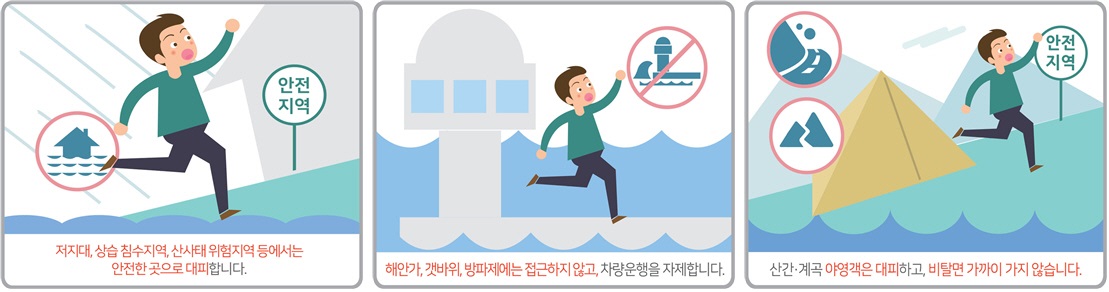 ∙ 저지대나 상습 침수지역, 산사태 위험지역, 지하 공간이나 붕괴 우려가 있는 노후주택·건물 등에서는 주변에 있는 사람들에게 알려주고 안전한 곳으로 이동합니다.
