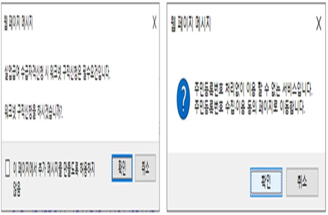 ⁕아래와 같은 구직신청 관련 팝업메시지는 취소 버튼 클릭 → 온라인 교육수강완료 후 구직신청 가능함