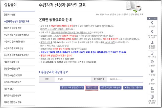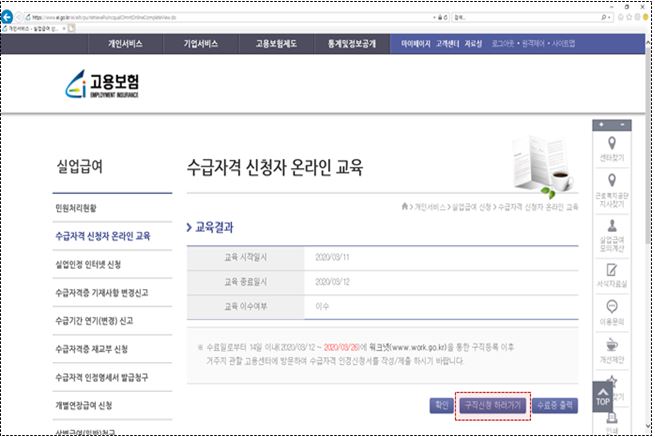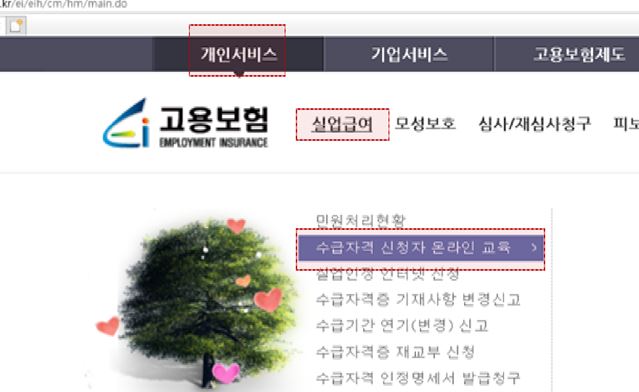 3) 공인인증서로 로그인 → 홈페이지 상단의 개인 서비스 → 실업급여 → 수급자격 신청자 온라인 교육