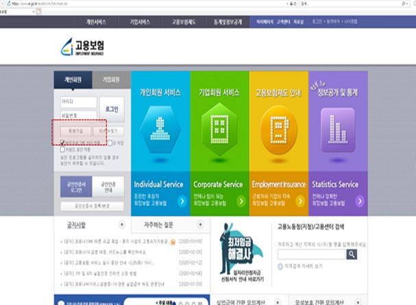 1) 고용보험 홈페이지(www.ei.go.kr) 회원가입(고용보험 모바일 어플리케이션도 사용 가능)