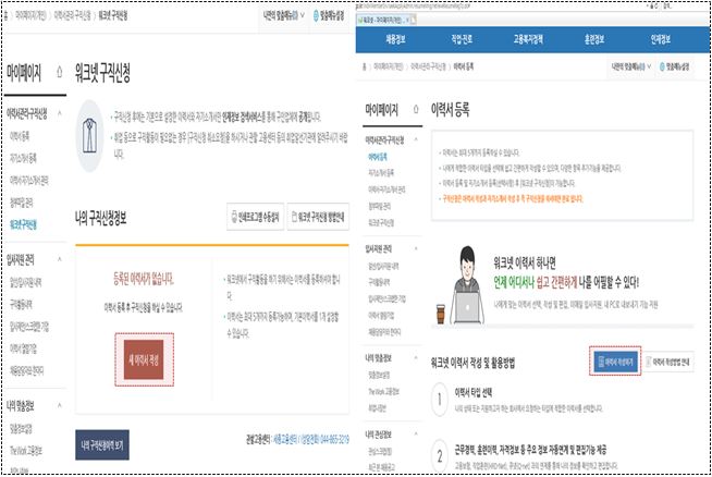 7) 구직신청 이전 ‘이력서 작성’ 버튼 클릭