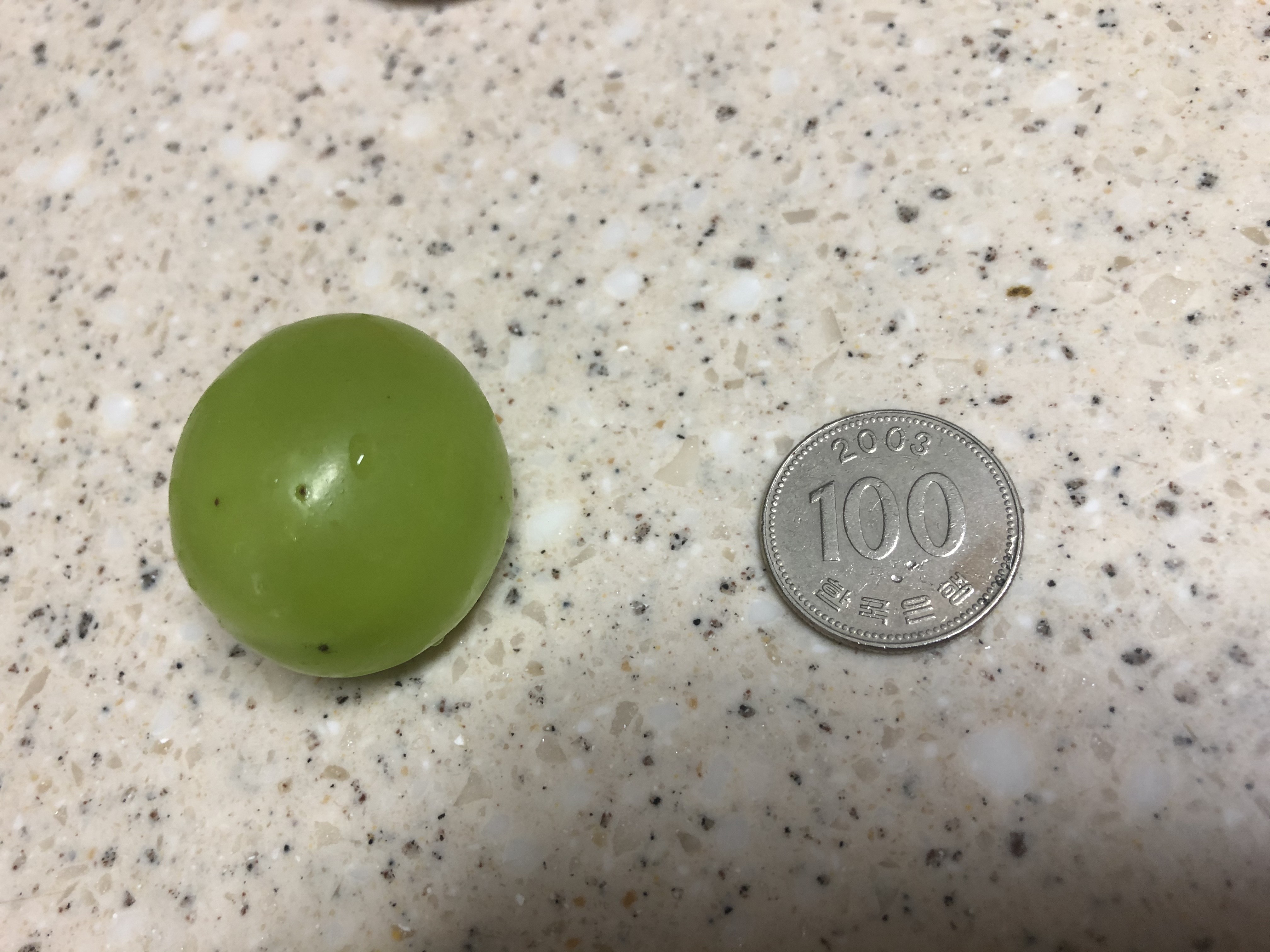 샤인머스킷 한 알의 크기는 거봉포도만해요. 500원짜리만해요.