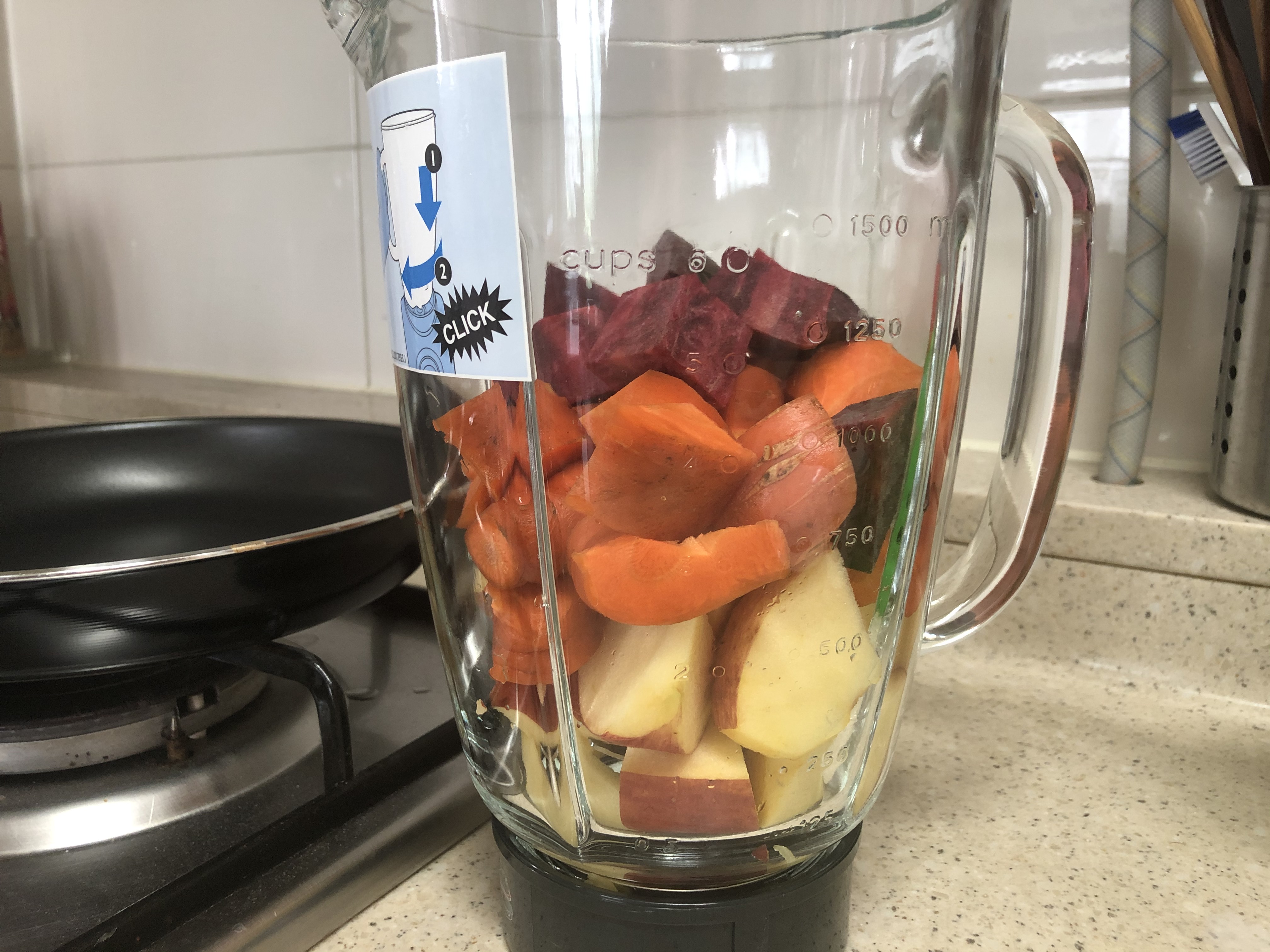 준비물: 사과 1개, 비트 1/3개, 당근 1개, 물 200ml 그리고 믹서기