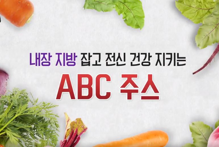 내장 지방은 내장에 붙어있어 운동만으로 빼기에는 어렵다고 합니다. 서울에서 부산까지의 거리를 세 번 뛰어야 7%의 내장 지방이 빠진다는데, ABC주스는 내장지방을 빼는데 탁월한 효과가 있어 운동하지 않아도 43%의 내장 지방이 줄어든 것을 직접 확인할 수 있었다고 합니다. 주변에서 쉽게 접할 수 있는 사과, 당근, 비트로 만든 ABC주스 한 잔으로 내장 지방을 줄여 건강을 잃지 말도록 해야겠습니다.