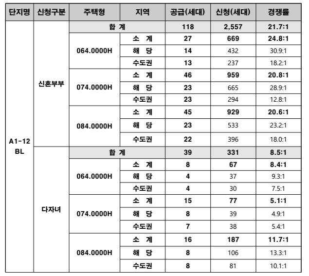 그리고, 아래는 A1-12 블럭의 청약 경쟁률입니다.
