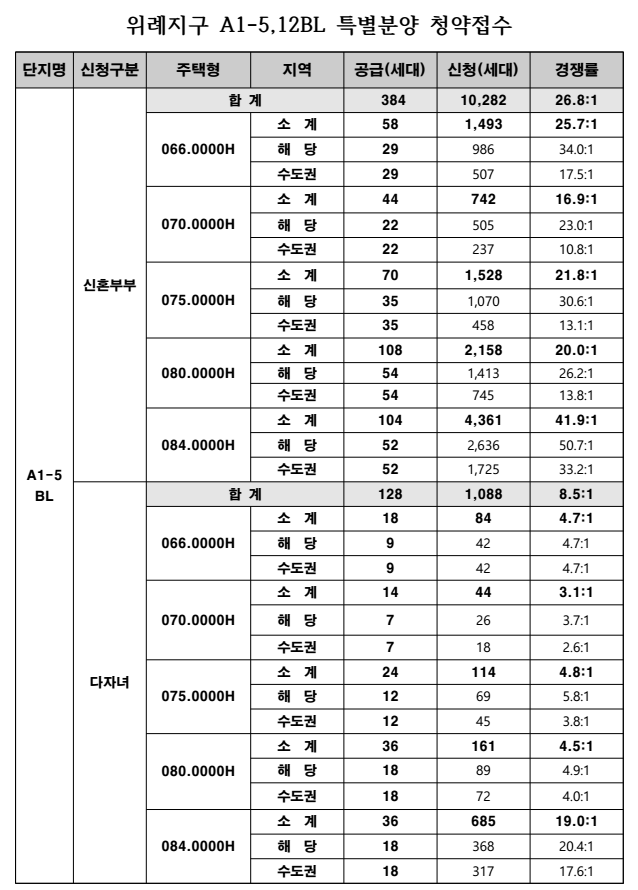 오늘 청약이 진행된 위례 A1-5, A1-12블럭의 신혼부부 특동, 다자녀 특공 청약 경쟁율입니다.