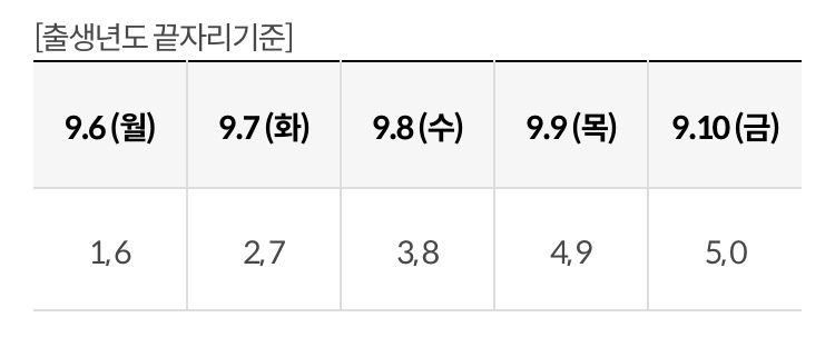 * 신청 기간 초인 9/6(월) ~ 9/10(금)까지는 출생년도를 기준으로 5부제로 신청받고 있습니다.