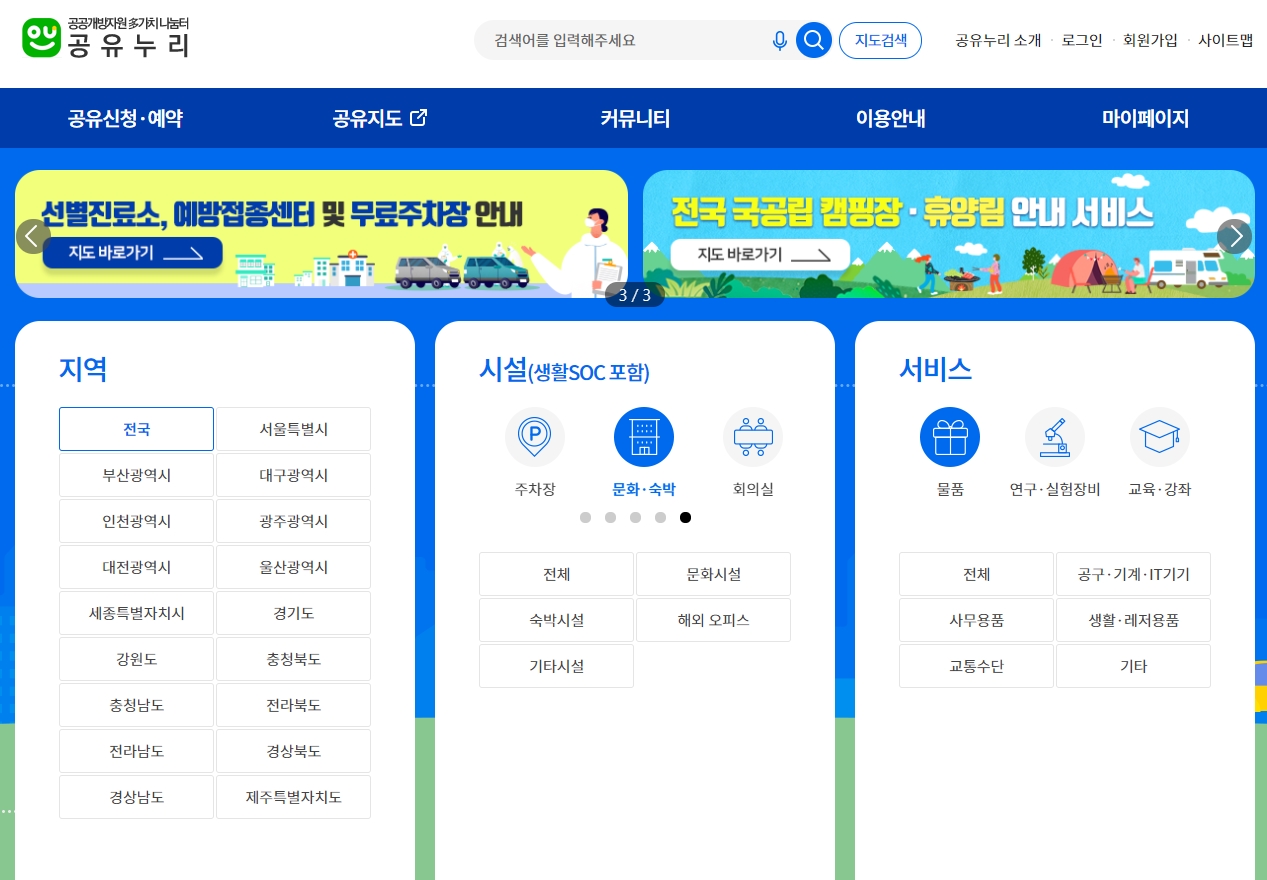 공유누리라는 사이트는 공공개방자원을 사람들에게 공유하기 위해 만들어진 사이트로, 국가나 지자체 공공시설이나 물품들을 저렴하게 또는 무료로 빌려 쓸 수 있게 서비스하는 사이트입니다.