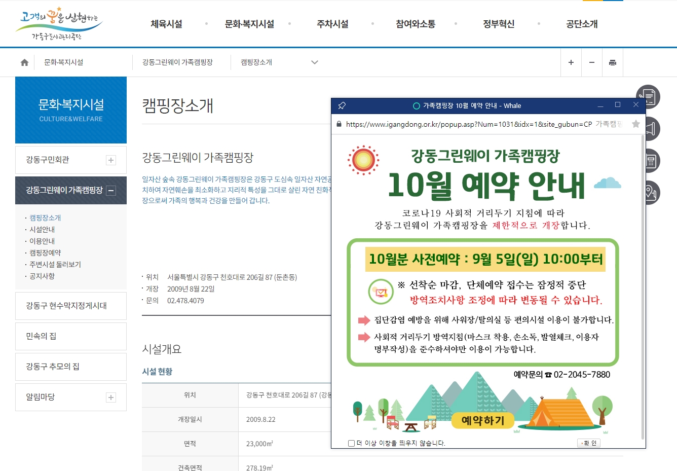 시설 정보를 클릭하면 해당 사이트로 넘어가고, 예약하기를 클릭하면 예약 사이트로 넘어갑니다.