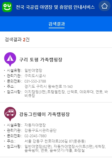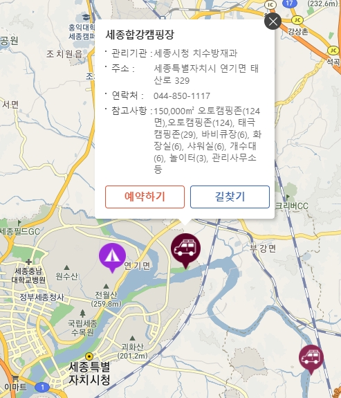 지도에 표시되는 아이콘을 눌러보면 해당 캠핑장에 대한 간략한 정보가 뜹니다.