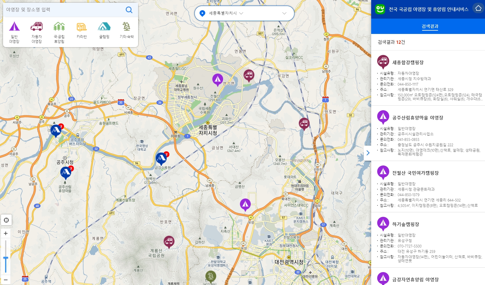 그리고, 우측에는 해당 지도에 보여지는 캠핑장 정보가 표시됩니다.