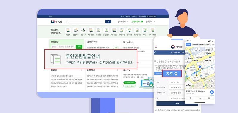 '지도' 버튼을 클릭하면 내 주변의 무인민원발급기 설치 현황을 한눈에 확인할 수 있고, '길찾기'를 통해 찾아가는 상세 경로도 안내해 줍니다.