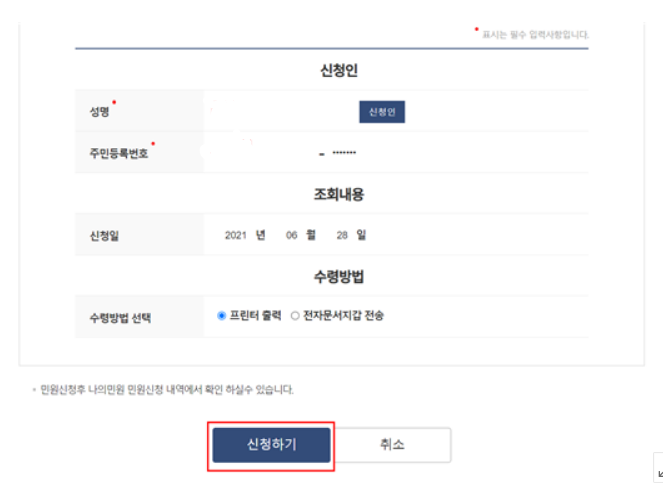 로그인하고 나면 신청인(성명, 주민번호), 조회내용(신청일), 수령방법(프린터 출력, 전자문서지갑 전송)을 선택하신 후 신청하기를 클릭하시면 됩니다. 전자문서지갑 전송은 카카오나 네이버 등에서 서비스 하는 전자문서지갑으로 전송이 됩니다.