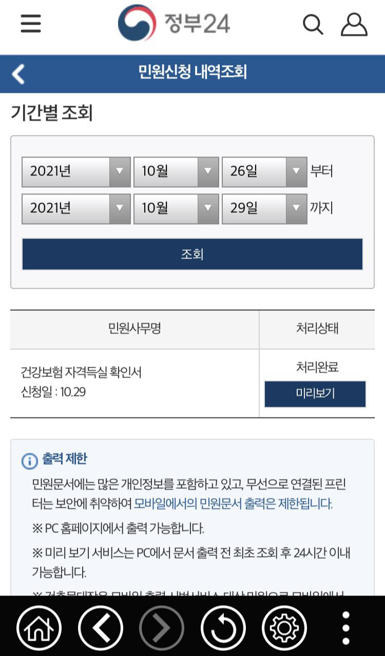 프린터출력을 선택하면 조회에서 미리보기가 가능하고, 유효기간(24시간) 안에 PC 정부24에서 프린터 출력이 가능합니다. 하지만 모바일은 프린터 출력이 불가능합니다. 어차피 프린트하기 위해서 PC에서 정부24 홈페이지에 접속해야 하기 때문에 전자문서지갑으로 전송하지 않을꺼면 PC 홈페이지에서 발급받는 것이 좋습니다.